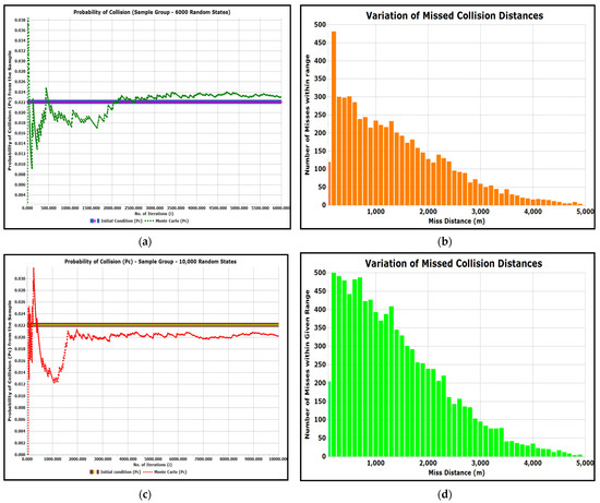 Autonomous collision assessment-Earth scenario (Monte Carlo) [16]. (a) Probability of collision (Pc-6000 random states); (b) State variations of missed collisions (6000 Distance-Km); (c) Probability of collision (Pc-10,000 random states); (d) State variations of missed collisions (10,000 Distance-Km).