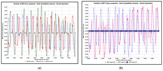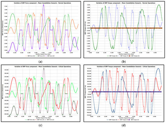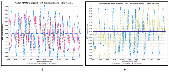Solar Radiation Pressure variations in different situations in operations [16]. (a) Variation of SRP force-Normal conditions (Newtons); (b) Variation of SRP torque—Normal conditions (N·m); (c) Variation of SRP force-Critical conditions (Newtons); (d) Variation of SRP torque-Critical conditions (N·m).