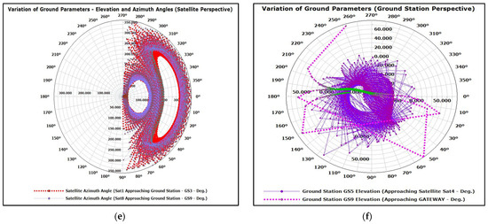 Figure 11e,f is dedicated to the ground parameters’ variations with the approaching satellites. Now, for the Moon, there is a slight difference from what is attained for Earth. The perspectives of the ground and satellite are crucial due to the placement of satellites in a hybrid form of constellation distant from the Earth’s surface. For instance, Figure 11e shows the variation of the satellite’s (Sat1 and Sat8) Azimuth and Elevation with respect to the approaching ground stations, whereas Figure 11f shows the variations of the Azimuth and Elevation angles of the ground station with respect to the approaching satellites (Sat4 and Gateway). This is important to differentiate the operating parameters and align them with respect to the given situation in orbit and on the ground (when the settlements happen on the Moon with a significant number of landings).