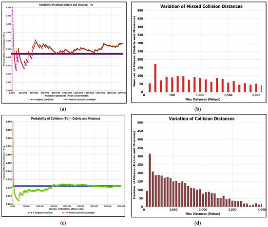 Figure 12 gives insights into the Monte Carlo analysis for the Moon’s side of collision chances (probability) in its orbital space. The methodology remains the same with due consideration to the local environment. It can be closely observed that Figure 12a has a sharp variation with 2000 random states and the number of misses varies randomly, as shown in Figure 12b, with situations of Debris and Mission collisions included. These variations are much different from what is observed in this analysis of the Earth scenario. The major reason for this is obviously the intensity of congestion over the Earth and over the Moon are widely distinct. The reason is that the algorithm has a fewer number of random states to iterate and speed up the progression with iterations to find the solution sharply and tends to linearize as an optimal solution is found at the end of propagation. The fewer number of random states doesn’t signify a less impactful form of analysis or prediction for a probable collision with respect to the method used. It only indicates that the number of probable collisions is less stable and needs to be balanced with appropriate autonomy to make the best solution for a particular situation during operations.