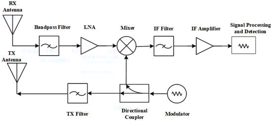 The time delay between the transmitted and received signals, denoted as , corresponds to the round-trip time of the signal. This echo signal is captured by the receiving antenna and directed into the RA. After passing through a bandpass filter and a low-noise amplifier (LNA) in the RA front-end, the signal is mixed with the local oscillator signal in the mixer, producing an IF signal [18]. After undergoing further filtering and amplification, the IF signal is processed by an analog-to-digital converter and a counter to extract the altitude information.