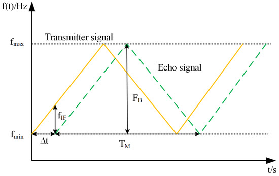 The frequency and time relationships of the transmitted and echo signals in the RA are depicted in Figure 2. The IF signal frequency obtained from the mixer processing is the difference between the frequencies of the transmitted and echo signals. The measured altitude can be calculated in relation to the IF signal frequency: