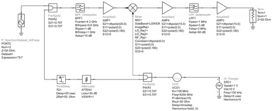 Based on the RF front-end architecture of the RA receiver, a behavioral-level simulation circuit model was developed using ADS 2022, as depicted in Figure 3. The model incorporates several key components designed to simulate the behavior of the RA receiver under 5G signal interference.