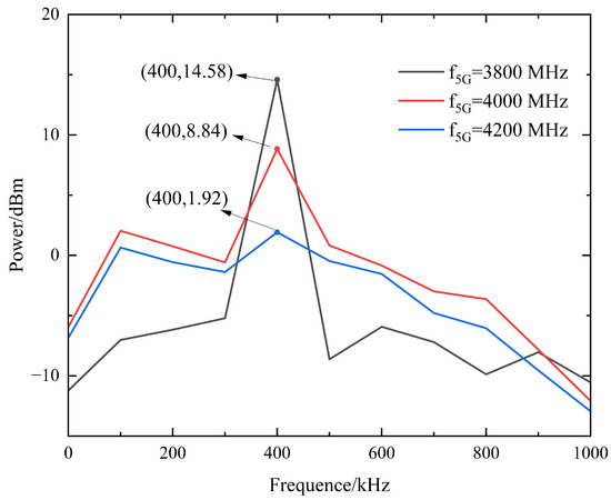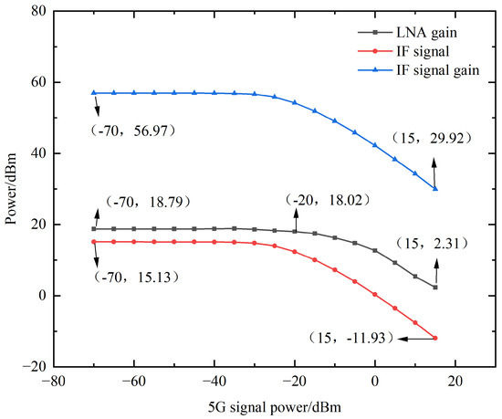 In Equation (15), the main parameters affecting the IF signal gain include the power and frequency of the 5G signal. The above parameters are changed to simulate and analyze the interference injection of 5G signals into the RA RF front-end, and the results are shown in Figure 6 and Figure 7.