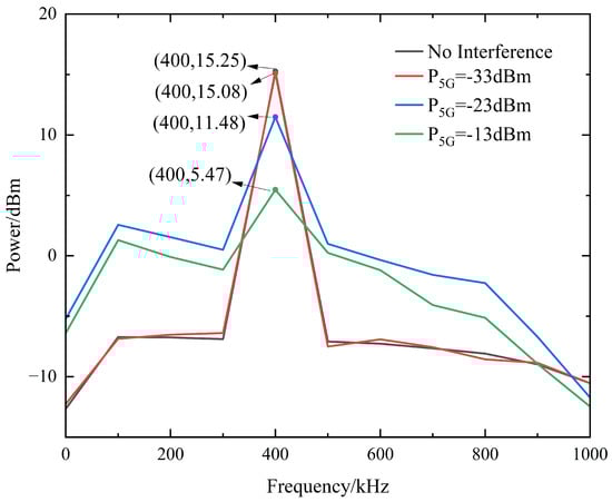 The IF power spectrum of the RA under the interference of 5G signals with different powers is shown in Figure 6. When there is no 5G signal interference, the power of the IF signal is 15.25 dBm, and the frequency is 400 kHz. When the interference signal power is −33 dBm, the power spectrum of the IF signal is essentially the same as that without interference, indicating that the 5G signal power does not cause the RF front-end to become overloaded at this time. However, when the interfering signal power increases to −23 dBm, the IF signal power decreases significantly. As the 5G signal power increases, the gain compression effect of the IF signal becomes more pronounced. When the interfering signal power is further increased to −13 dBm, the IF signal power decreases further to 5.47 dBm, and the gain compression effect becomes particularly significant, indicating that the 5G interfering signal has caused more severe interference to the echo signal, leading to a significant decrease in system performance. It can be seen that with the increase in the 5G interference signal power, the gain compression effect of the RF front-end becomes more pronounced.