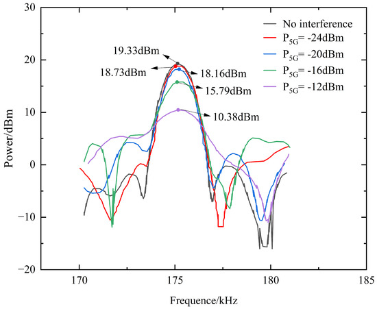 Figure 7 illustrates the output IF power spectrum of the RA receiver when affected by the 5G signal at different center frequencies. At the same 5G signal power of −20 dBm, it is evident that the closer the center frequency of the 5G interference signal is to the working band of the echo signal, the more obvious the IF signal gain compression effect becomes. Although the power of the 5G signal entering the RA RF front-end is the same, the closer the center frequency of the 5G signal is to the operating band of the echo signal, the less the bandpass filter attenuates the 5G signal, and the higher the power of the 5G interference signal entering the LNA. As a result, the gain compression effect of the RF front-end becomes more pronounced.
