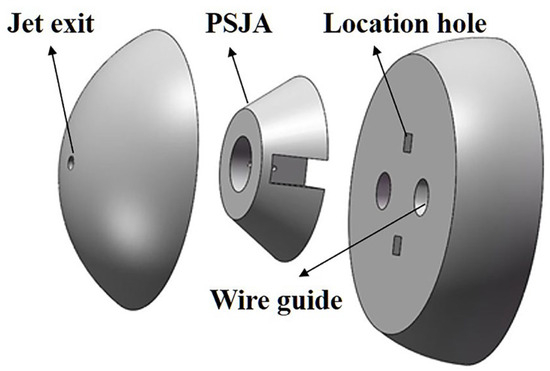 The model used in the present study is shown in Figure 1. It involves a hemisphere with a diameter of 70 mm. A cylindrical PSJA with a diameter of 12 mm and a height of 9 mm was designed inside the hemisphere, with two electrode holes on each side for installing tungsten electrodes with a diameter of 1 mm. A Phantom V2640 high-speed camera was used in this experiment with a frame rate of 50,000 fps and an exposure time of 1 μs.