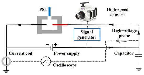 The circuit connection used in the experiment is shown in Figure 2. The voltage regulator can adjust the input voltage of 380 V to the output voltage 0–430 V, which is used to charge the high-voltage pulse power supply and adjust the voltage across the PSJA. In the circuit, an ultrahigh-voltage thin-film capacitor is connected in parallel across the PSJA to speed up the release of electrical energy. The power supply and the high-speed camera are controlled synchronously using a signal generator. A high-voltage probe and a current coil are used to measure the voltage and current during the PSJA discharge [38].