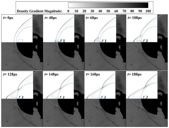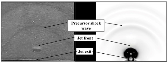 In order to verify the reliability of the above methods, the PSJ experimental result by Belinger et al. [39] was selected for comparison. Figure 4 shows a comparison between the experimental flow field structure observed 20 μs after discharge and the numerical results obtained 20 μs after adding the energy source term. In the experiment, the actuator was a cylinder with a diameter of 4 mm and a height of 4 mm, the nozzle diameter was 1 mm, and a discharge energy of 50 mJ and an electric heating efficiency of 5% were used in the calculation. It can be seen that, at the same moment, the main flow field structures such as precursor shock wave and jet front obtained by calculations and experiments are in good agreement, indicating that the simulation method of PSJ mentioned above is reliable.