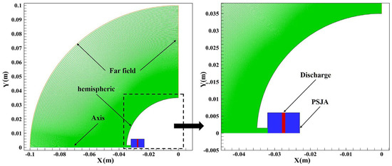 The numerical simulation method and preliminary validation of the opposing PSJ are then provided. The dimensions of the model and the actuator have been mentioned above. The discharge area where the energy source term was added approximately corresponds to the region with a height of 1 mm in the middle of the actuator cavity. A two-dimensional axisymmetric structure grid was adopted in the calculation, and the center of the sphere was taken as the origin of the coordinates. The free flow boundary and outlet boundary were both pressure far-field boundaries, and a no-slip condition was applied at the wall boundary. The refined grids were applied to the wall and regions where shock waves may occur. The height of the first grid layer of the wall was 0.021 mm and the corresponding y+ was 1, as shown in Figure 5.