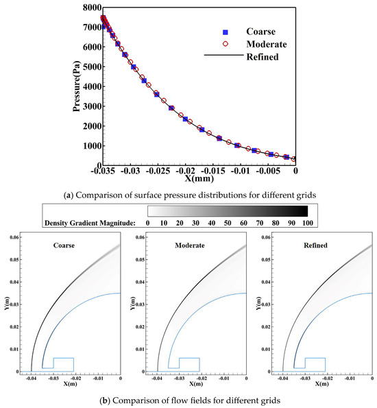 Three grid systems were established to verify the grid independence, and the mesh size was 93,000, 188,000, and 271,000, respectively. Figure 6 shows the calculated pressure distribution on the surface of the hemisphere model and the density gradient diagram. It can be seen that the calculated results of all three grid systems are nearly identical, the shock wave downstream computed by the coarse grid is less distinct compared to the other two grid systems. To balance calculation efficiency and flow field details, the moderate grid was selected for subsequent numerical simulation.
