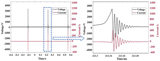 A typical experiment was selected to validate the numerical results. The parameters of the incoming flow and plasma actuation in the experiment are shown in Table 1, where Ma is the Mach number of the incoming flow, P0 is the total pressure of the incoming flow, T0 is the total temperature of the incoming flow, C is the capacitance, f is the discharge frequency, and E is the discharge energy. The discharge energy E = 0.5 Cu2, which is determined by the capacitance and discharge voltage. Figure 7 shows the voltage and current values of a discharge moment recorded in the experiment, indicating that the discharge voltage is approximately 3250 V and the discharge energy is about 0.84 J.