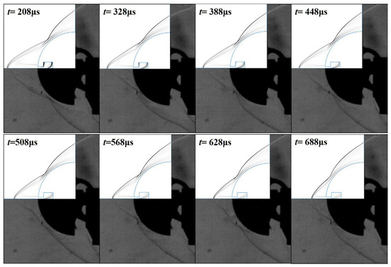 Figure 8 shows a comparison of the flow field structure between the experiment and numerical simulation after discharge, indicating that the flow field structure obtained from the experimental schlieren and the numerical simulation within approximately 700 μs is basically consistent. It can be seen from the figure that the flow field exhibits a long penetration mode after the plasma synthesis jet is ejected, which is due to the small discharge energy and the highest average total pressure of the actuator cavity being about 26 kPa (as shown in Figure 9), resulting in a small total pressure ratio of approximately 0.03 between the jet and the incoming flow.