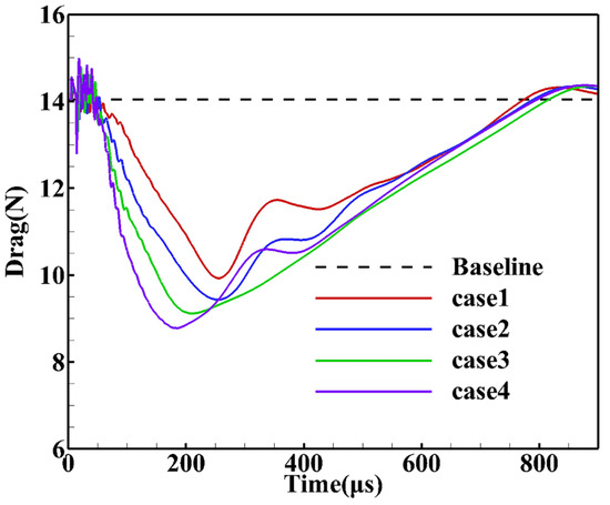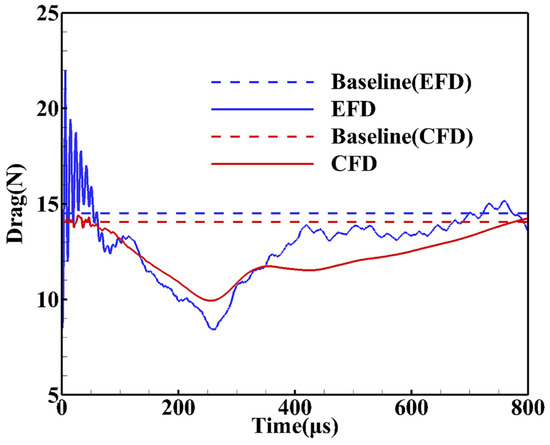 A comparison of the drag between experimental and numerical simulations after the discharge is given in Figure 10. In the experiment, strong electromagnetic interference generated at the moment of discharge partly affected the sensor and collection system, resulting in obvious oscillations in the measured drag curve. The drag curve obtained by numerical simulation also shows weak oscillations during 0–60 μs, caused by the combined effect of heating and expansion of the gas in the cavity, which continuously impacts the wall, and the reaction force of the jet. The experimentally measured baseline drag value is about 14.51 N, and the calculated baseline drag value is about 14.04 N, with an error of about 3.26%. As the plasma synthesis jet is ejected, the drag gradually decreases to the minimum value at about 260 μs, which is about 8.40 N in the experiment and 9.93 N by calculation. Afterward, the drag value gradually increases and returns to the baseline value at about 800 μs.