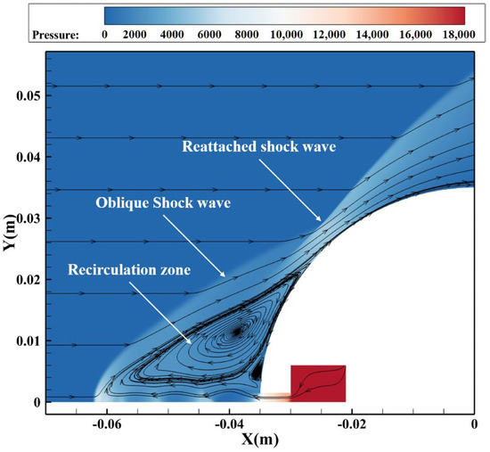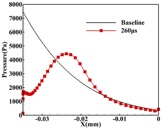 Based on the above chart, it can be seen that the numerical simulation method used in this study shows good agreement with the experimental results and can be used as an effective research method for the opposing PSJ in hypersonic flow. Given the convenience of the numerical simulation method, it will be adopted as the primary approach in this study. Figure 11 and Figure 12, respectively, show the surface pressure distribution of the model and the pressure contour of the flow field at the moment of minimum drag (260 μs). Figure 12 shows that the total pressure in the cavity is about 18 kPa and the nozzle is in an over-expanded state. At this time, the flow field presents a typical LPM structure. The PSJ pushes the detached bow shock wave away from the model to form a weak oblique shock wave structure. A recirculation zone is formed on the model surface and a reattached shock wave is generated downstream of the recirculation zone, and the reattachment point corresponds to the peak pressure position on the model surface, as shown in Figure 11. The surface pressure near this point is slightly larger than in the basic flow field, while the jet flow and recirculation zone cause the pressure on the model to be much lower than in the basic flow field upstream, leading to a significant reduction in drag.