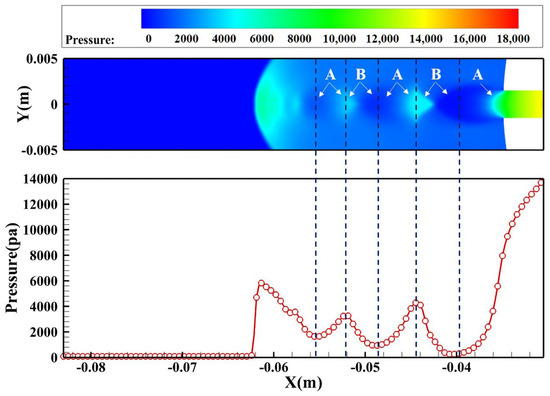 Correspondence between flow field and pressure value near the nozzle (A: expansion wave, B: oblique Shock). (The red circles represent the corresponding x-axis coordinate).