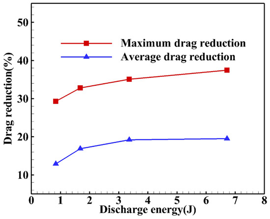 Figure 15 shows the change in drag of the model over time for Cases 1–4. It can be observed that a higher discharge energy results in a smaller , indicating that the plasma synthesis jet achieves a better maximum drag reduction effect or a higher . In addition, the higher the discharge energy, the earlier occurs. Table 4 provides the detailed drag reduction parameters for Cases 1–4, and the change of drag reduction effect with discharge energy is shown in Figure 16. It can be seen that both and increase with higher discharge energy. However, the improvement in from Case 3 to Case 4 is not obvious, indicating that the impact on plateaus once the discharge energy reaches a certain threshold.