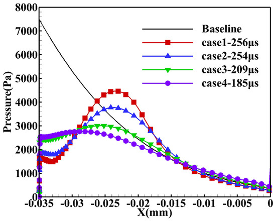 In order to further analyze the effect of different discharge energies on the drag reduction characteristics of PSJ, the surface pressure distributions of the model at the moment when the respective drag value reaches in Cases 1–4, along with the pressure contours of the flow field, are captured and presented in Figure 17 and Figure 18. From Figure 17, it can be seen that at low discharge energy (Case 1 and Case 2), there exists a brief low-pressure region near the nozzle, after which the surface pressure of the model rises to an obvious peak value along the flow direction and gradually decreases to the base value. However, at high discharge energy (Case 3 and Case 4), the pressure near the nozzle is higher than that in cases of low discharge energy, and the surface pressure of the model rises slightly along the flow direction and decreases to the reference value. In these two high-discharge energy cases, the surface pressure of the model remains consistently lower than the reference value. By combining the flow field in Figure 18, the drag reduction mechanism of PSJ under both high and low discharge energy conditions can be explained. With the ejection of PSJ, the original bow shock wave is pushed away, forming a weaker oblique shock wave. At lower discharge energy, the shock wave travels farther, accompanied by a smaller oblique angle. Therefore, the surface pressure of the model near the nozzle is lower, but at the same time, the reattached shock wave is stronger, resulting in a pressure bump at the reattachment point. This corresponds to the peak value of the pressure distribution curve in Figure 17. As the discharge energy increases, the distance of the shock wave decreases, the oblique angle of the shock wave expands, resulting in relatively high pressure near the stagnation point. At the same time, the reattached shock wave is weaker, the flow field becomes fuller, and the surface pressure distribution gets smoother. Therefore, the drag reduction effect of PSJ is better at higher discharge energy.