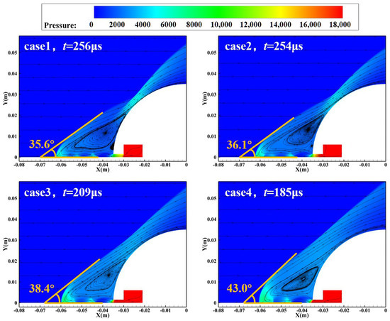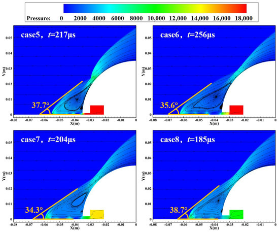 Pressure contours of the flow field at the moment of (Cases 5–8).