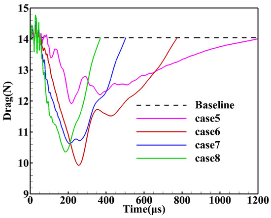 and are defined as parameters to measure the drag reduction effect of the opposing PSJ, as shown in Equations (3) and (4), where is the maximum drag reduction, is the average drag reduction, is the reference drag value, is the minimum drag value, and is the drag reduction duration. The specific values are shown in Table 2.