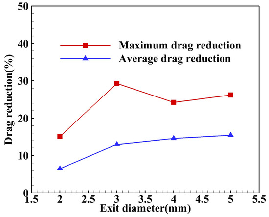 Figure 20 indicates the change in drag of the model over time for Cases 5–8. It can be seen that as the nozzle diameter increases, the time required for the drag of the model to recover to the reference value decreases, which is consistent with the change in average pressure of the cavity mentioned above. Table 6 provides the detailed drag reduction parameters of Cases 5–8, and the change in drag reduction effect due to nozzle diameter is given in Figure 21. Drag reduction duration decreases as the nozzle diameter increases, the maximum drag reduction effect peaks at a nozzle diameter of 3 mm, while the average drag reduction effect increases with increasing nozzle diameter.