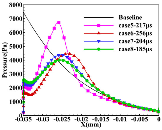 Similarly, in order to further analyze the influence of different nozzle diameters on the drag reduction characteristics of PSJ, the surface pressure distributions of the model at the moment when the respective drag value reaches in Cases 5–8, along with the pressure contours of the flow field are obtained, as shown in Figure 22 and Figure 23. Consistent with the previous analysis, the peak value of the surface pressure distribution curve on the model corresponds to the position of the reattachment point of the shock wave. As seen in Figure 23, the strong reattached shock wave of Case 5 leads to an obvious high-pressure region near the reattachment point, resulting in a higher peak value of the pressure distribution curve. In the other three cases, the reattached shock wave is weaker, so the pressure at the reattachment point is lower, and the pressure distribution curves are similar. In Case 6, the original bow shock wave is pushed away the farthest, and the intensity of the oblique shock wave is also the weakest. Consequently, the pressure in the upstream region of the model is lower than that observed in other cases, resulting in the greatest .