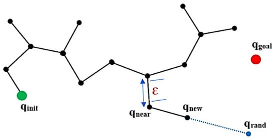 Figure 2. The construction process of RRT [25]. Input: Initial points , . Incremental distance . Output: RRT graph G.The RRT exploration method contains a free space-spanning tree construction and query phases. Its performance comes from the fact that it does not require a pre-computation stage. A suitable property of this approach is that the growth is strongly biased towards unexplored areas of free space, so rapid exploration occurs. This construction allows, in particular, the processing of large dimensions; thus, the search remains steady in areas of immense dimensions.