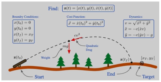 OCP problem [39]. This situation can be modeled as a boundary-value problem. The goal is to find the trajectory, assuming that (1) the cannonball is a point mass, (2) air friction is modeled using quadratic drag, and (3) the amount of powder is proportional to the initial speed squared.