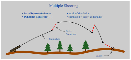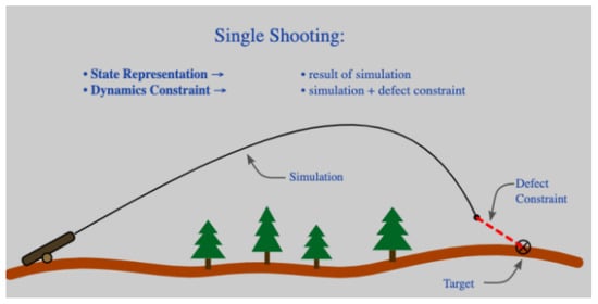 - Single shooting method: The main idea begins meticulously discretizing the control u and the denoted state x. This transforms the initial optimal control problem into a finite-dimensional, potentially significant, nonlinear programming problem (NLP). The single shot involves approximating the trajectory using a single integration. In other words, it is like firing a cannonball, checking where the ball has landed, adjusting the initial velocity, and repeating. This process is repeated until the error between the target and the place where the ball landed, called a defect, denoted , is reduced to zero ( ). The optimization algorithm is designed to find the initial speed that achieves this precision. This behavior is illustrated in Figure 4.