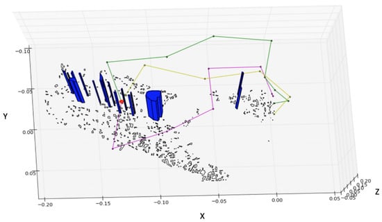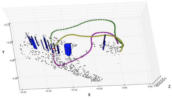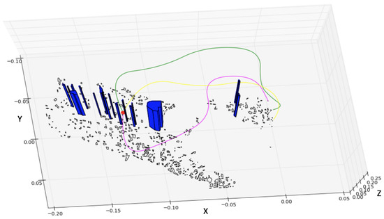 Finally, now that the flight plans are well established, we use them as a reference to calculate the continuous trajectories. Considering the UAV’s dynamics, previously defined in Equation (4), we can calculate three 5D Dubins trajectories avoiding obstacles (see Figure 10). The color lines in Figure 8, Figure 9 and Figure 10 highlight the three different paths.