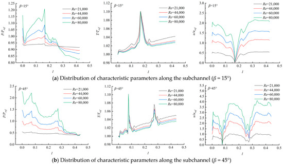 According to Figure 12a,b, the values of each characteristic parameter increased with the increase in the inlet Reynolds number, but the position of each characteristic parameter along the path did not move. The inlet Reynolds number will only change the magnitude of the characteristic parameter values and will not change the distribution of the characteristic parameter values along the path. It indicates that the inlet Reynolds number does not change the flow structure type along the subchannel.