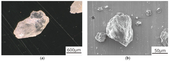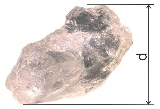 Two major materials of silica sand (at a 1:1 mixture ratio of silica sand No. 5 (TakeoriKogyo, Tokyo, Japan) and silica sand No. 6 (TakeoriKogyo, Tokyo, Japan)) and lunar soil simulant [12] (FJS-1, SHIMIZU CORPORATION, Tokyo, Japan) were used to simulate the soft soil of the lunar surface. Silica sand was observed with a digital microscope (VHX5000, KEYENCE CORPORATION, Osaka, Japan), and lunar soil simulant was observed with a scanning electron microscope (JSM-6390LT, JEOL Ltd., Tokyo, Japan). An example of the observed images of the soils is shown in Figure 1. Particle diameters were measured from these images using ImageJ [13]. The particle diameter was defined as the Feret diameter [14], which represents the unidirectional size of a particle in its projected image. The Feret diameter is measured as the distance between two parallel lines drawn in a constant direction across the projected particles, as illustrated in Figure 2. Using this method, we measured 979 particles of silica sand and 1150 particles of lunar soil simulant. Figure 3 presents the particle size distribution of the measured samples. The average particle size was 548 μm for silica sand and 30 μm for the lunar soil simulant. Compared to silica sand, lunar soil simulant has a much smaller particle size and a more angular shape.