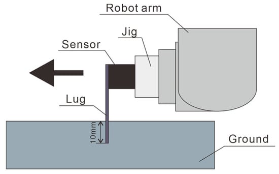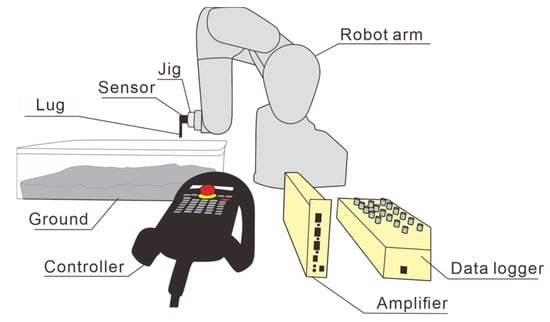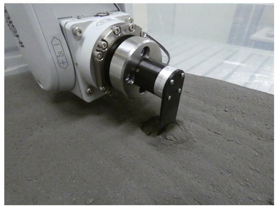 Using a robot arm, we measured the reaction force exerted on the wheel lugs by the soil while the rover was running. Figure 4 and Figure 5 show the appearance of the device and the schematic diagram for measuring the reaction force that the lug receives from the soil. Figure 6 shows the actual image of the test to measure the reaction force that the lug receives from the soil. A three-axis force sensor (USLG25, Tec Gihan Co., Ltd., Kyoto, Japan) was fixed to the end of a robot arm (RV-4FR, Mitsubishi Electric Corporation, Tokyo, Japan). A flat plate, shaped like a wheel lug, was attached to the sensor, and the reaction force from the soil on the lug was measured by moving the robot arm as if it was pushing the soil with this flat plate. A clear box (715 mm long, 337 mm wide and 177 mm high) filled with lunar soil simulant or silica sand to a depth of about 50 mm was placed under the robot arm for measuring the reaction force. The robot arm was manipulated to insert the lug 10 mm into the soil and then moved horizontally to push the soil with the surface of the lug while maintaining the penetration depth. During this period, the load recorded by the sensor was captured by the software (DSS300-HR, Tec Gihan Co., Ltd., Kyoto, Japan). The sampling frequency was set to 1 kHz, with a test duration of 10 s.
