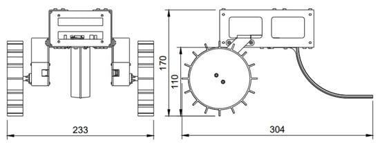 Figure 7 shows the appearance of the rover. Fusion 360 (Autodesk Inc., Tokyo, Japan) was used to design the drawings, and a 3D printer (RAISE 3D Pro 3, Raise 3D Technologies, Inc., Irvine, CA, USA) was used to create the rover body and wheels using ABS resin (black, 1.75 mm, Raise 3D Technologies, Inc., CA, USA) as the material. This rover is equipped with two servo motors (XC330-M288-T, ROBOTIS Japan, Tokyo, Japan), and a control board (consists of Spresense (Sony Corporation, Tokyo, Japan), an expansion board (Sony Corporation, Tokyo, Japan) and a DYNAMIXEL Shield (ROBOTIS Japan, Tokyo, Japan))are used to control the wheels at any angular speed. In these tests, the left and right motors were driven at 10 min−1. Drawings of the wheels used on the rover are shown in Figure 8. Three types of rover wheels were created: a circular wheel with lugs, an eccentric wheel with a 25 mm eccentric axle position and an elliptical wheel characterized by an ellipticity of 0.75. A drawing of the small rover is shown in Figure 9. The overall dimensions of the rover with circular wheels are 304 mm long, 233 mm wide and 170 mm high. The lightweight 300 g rover was created using the 3D printer and resin shown above.