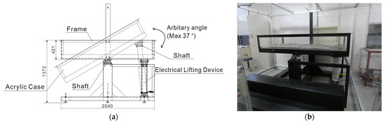 Figure 11 shows the appearance and tilting mechanism of the running test field for lunar soil simulant created in this study. The running test field of the lunar soil simulant consists of an acrylic container that is 2000 mm long, 1000 mm wide and 400 mm high, fixed to an upper frame made of steel, which is installed on the lower frame via a rotating mechanism. The test field can be adjusted in angles by driving an electrical lifting device (ac-m-1-500, SUGATSUNE KOGYO Co., Ltd., Tokyo, Japan), mounted between the frames, to achieve any tilt angle up to 37 degrees. The soil was the same lunar soil simulant as described in ‘2.1 Silica sand and lunar soil simulant used for running test’ and was spread to a depth of about 100 mm within the effective running surface of the acrylic container.