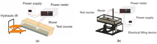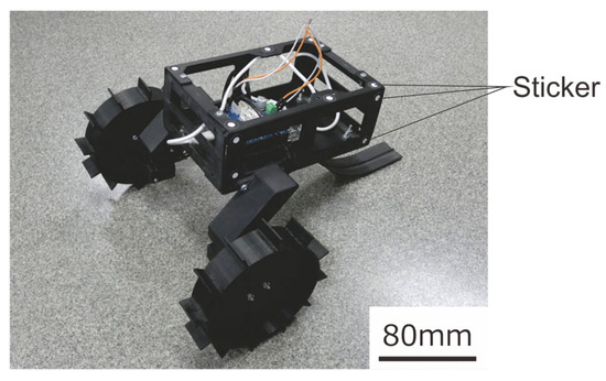 A schematic diagram of the running test is shown in Figure 12. Running time and slip ratio were used as indicators of the rover’s running performance. Running time was measured with a stopwatch for the time taken to traverse 700 mm. The slip ratio λ is defined by the following equation, using the wheel radius r, angular velocity ω and wheel travel speed Vw.