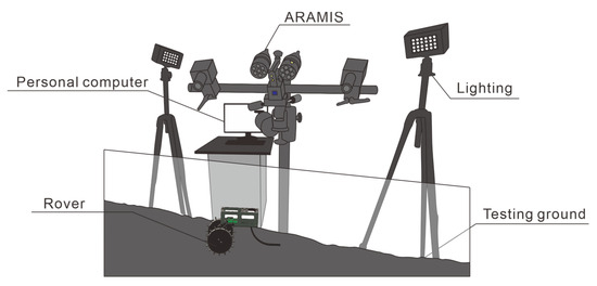 The sinkage of the small rover during running was measured using a non-contact 3D displacement and strain measurement system [17] (ARAMIS Adjustable 24M, Carl Zeiss AG, Oberkochen, Germany), as shown in Figure 14. As shown in Figure 15, six dedicated reflective stickers were affixed to the top surface and four to the sides of the created small rover. In addition, at least three reflective stickers were affixed to the top and two to the sides of the exterior walls of the running test field. Two lights were used for illumination, and two digital cameras mounted on ARAMIS took continuous synchronized images. By tracking the reflective stickers on the images, the vertical displacement of the rover relative to the soil surface was obtained. The sampling frequency was 25 Hz, and the measurement time was 20 s. The data were recorded using the dedicated software (ZEISS INSPECT, Carl Zeiss AG, Oberkochen, Germany).