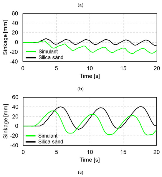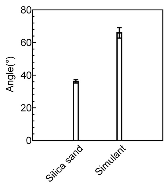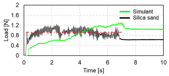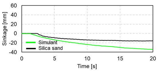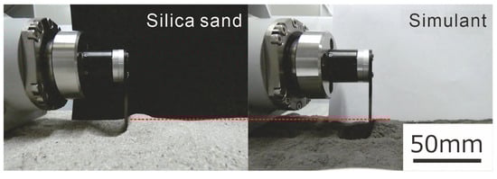 Figure 18 and Figure 22 show that large amounts of sinkage are associated with running inability. This section discusses the differences in sinkage of the rover between silica sand and lunar soil simulant. The lunar soil simulant (FJS-1) is strongly affected by the packing, such as dense or loose packing. It has been reported that there are higher dilatancy properties and greater sensitivity to density compared to silica sand [18]. In order to simulate the density of the lunar surface (1.1 to 1.6 g/cm3, at a depth of less than 50 mm), the running test in this study was conducted under loosely packed conditions, with an average shear torque of less than 0.30 cNm, measured by a vane shear tester. When the rover runs on the lunar soil simulant in this state, the lunar soil simulant changes from a loosely packed state to densely packed state as the lugs of the wheels push on the soil. During the transition from loose packing to dense packing, particles move to fill the voids between them, making it difficult for the lugs to obtain sufficient reaction force. As shown in the results from measuring the reaction force in Figure 16, the lunar soil simulant does not provide sufficient reaction force until it is densely packed. On the other hand, on silica sand, the reaction force is more easily transmitted to the lugs because there are little voids for volume change in the silica sand. In this study, the rover’s wheels were driven at 10 min−1, which means that the time between the entry of the lugs into the soil and their escape is approximately 1.2 s. Therefore, when driving on the lunar soil simulant, only a small reaction force can be obtained, as the lugs detach from the soil before sufficient reaction force is generated.