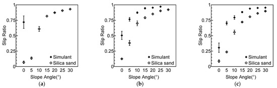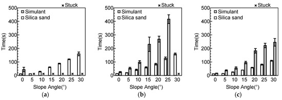 Figure 18 shows the running time for each slope angle, while Figure 19 shows the slip ratio for each slope angle. The rover with circular wheels was unable to run at angles greater than 5 degrees on the lunar soil simulant and got stuck. Even at 0 degrees, the running time on the lunar soil simulant was 370% greater than that on the silica sand, and the slip ratio was as high as 0.71, indicating low running performance. The rover with elliptical wheels was able to run at angles up to 25 degrees on the lunar soil simulant but got stuck at 30 degrees. When comparing silica sand and lunar soil simulant, the running time for lunar soil simulant was 180% greater at 0 degrees and 327% greater at 25 degrees. Additionally, the running performance on lunar soil simulant decreased as the running angle increased. The difference in the slip ratio between silica sand and lunar soil simulant converged as the running angle increased, but at all angles, the slip ratio was higher for running on lunar soil simulant. The rover with eccentric wheels was able to run at angles up to 30 degrees on the lunar soil simulant without getting stuck. As with the elliptical wheels, the difference in the running time on lunar soil simulant and silica sand increased, requiring more time to run on the lunar soil simulant. The difference in the slip ratio converged as the running angle increased, but at all angles, running on the lunar soil simulant had a higher slip ratio. Figure 20 shows the observed images by the 3D scanner during the running, as well as the ‘after-sliding’ running angles. Figure 21 shows the ‘after-sliding’ angle of the slope. In the case of running on silica sand, the ‘after-sliding’ slope becomes gentle, while with lunar soil simulant, the ‘after-sliding’ slope becomes steep.