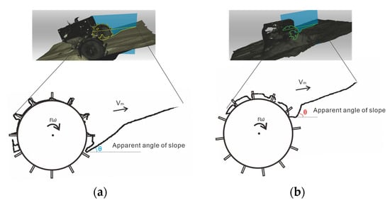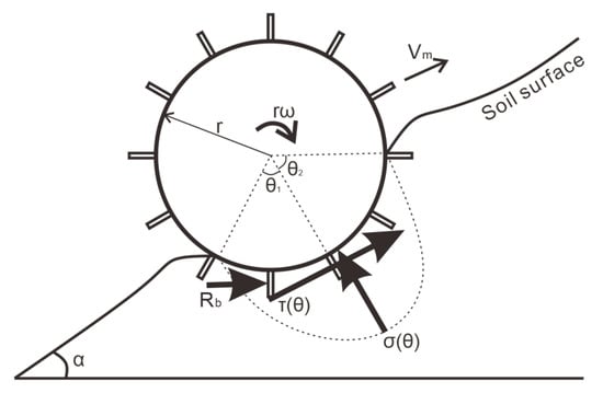 Here, the interaction model between the wheel and the soil on the slope is illustrated in Figure 23, and the traction force of the wheel is expressed in Equation (3). The reaction force that the lugs receive from the soil is represented in the latter part of the equation [19].