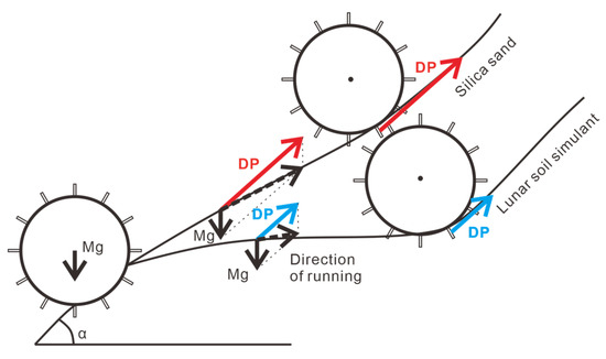 In this equation, r represents the wheel radius, b is the wheel width, θ1 is the wheel penetration angle, θ2 is the wheel escape angle, τ is the shear stress, σ is the normal stress, Lj is the lug width, λ is the slip ratio and Rb is the pressure exerted on the lug by the sand. A study on the generation of traction force has reported that the effect of the lugs is independent of the normal stress distribution beneath the wheel and has a greater effect on the running performance of the wheel mechanism than the stress distribution itself [20]. Figure 24 shows a simplified mechanism to explain the differences in sinkage. If sufficient reaction force cannot be obtained from the lugs, the rover’s traction force is reduced, and the resultant force of the gravitational and traction forces acting on the rover directed downward. As a result, the rover’s sinkage is accelerated, leading to the phenomenon of getting stuck. Therefore, in this study, it was shown that on silica sand, where the lugs of the wheels can generate a large reaction force, the running time and slip ratio are low. In contrast, on the lunar soil simulant, where only a small reaction force can be generated, the running time and slip ratio are high.