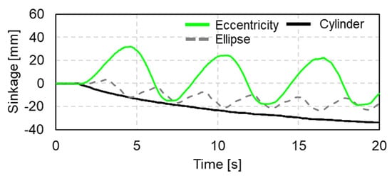 Figure 22 shows the measured sinkage for the rover body while running at 20 degrees. For all wheels, the sinkage of the rover body was greater when running on simulant compared to silica sand. Among these, the circular wheel has the largest sinkage. Considering the results of the running tests in Figure 18, this large amount of sinkage is associated with the running inability. On the other hand, the rover equipped with elliptical and eccentric wheels runs while the rover body moves up and down. This up-and-down motion allows it to recover from sinkage while moving forward, thereby reducing the amount of sinkage. In particular, the rover equipped with the eccentric wheel, which exhibits greater vertical motion, was able to further suppress the amount of sinkage. The results of the running tests showed that the rover equipped with eccentric wheels was able to climb up a steep slope even on the lunar soil simulant.