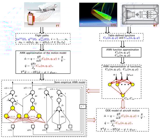 To overcome the above-mentioned difficulties, which are typical for traditional models, both in terms of differential equations and ANN models, it is suggested to use a combined approach. Its basis is ANN modeling because only in this variant is it possible to obtain adaptive models. Theoretical knowledge about the modeling object, existing in the form of ordinary differential equations (for example, traditional models of aircraft motion), is introduced in a special way into the ANN model of hybrid type (semi-empirical ANN model, gray box model). In this case, a part of the ANN model is formed on the basis of the available theoretical knowledge and does not require further adjustment (training). Only those elements that contain uncertainties, for example, the aerodynamic characteristics of the aircraft, are subject to adjustment and/or structural correction in the process of training the ANN model.