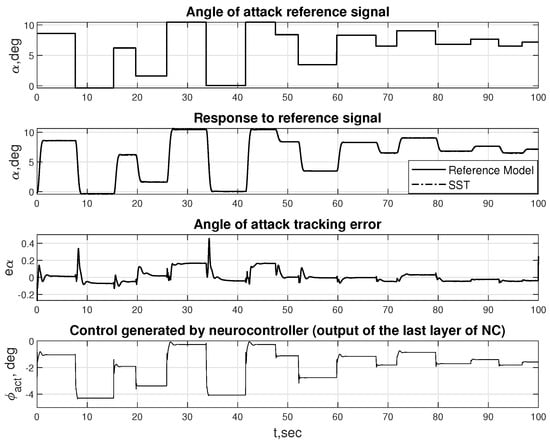 An alternative variant is based on online linearization of the control object. In this option, the most promising is the use of nonlinear transformation in feedback (feedback linearization), which is selected in such a way that the dynamical system closed by such feedback becomes linear [71,72,73]. At the same time, the traditional linearization used in flight dynamics problems [33,34,35] yields a model that has the required accuracy only in the single operational mode of the nonlinear system, as well as in a small neighborhood of this mode. In contrast, the feedback linearization approach allows obtaining an accurate model in the whole region of the operating modes of the object under consideration. For aircraft control, this approach is often referred to as nonlinear dynamic inversion (NDI) [74,75,76,77,78,79,80]. The adaptability of the system based on the NDI approach is provided by adjusting the nonlinear transformation in the negative feedback enclosing the nonlinear control object. A valuable property of the NDI approach is that this transformation is a nonlinear function of several variables. This means that it is not necessary to use a recurrent neural network to represent a nonlinear dynamic model [81,82,83,84,85,86]. A feedforward network that efficiently handles the representation of functional transformation in feedback is sufficient.