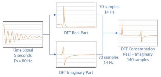 - A Discrete Fourier Transform (DFT) is applied to the time-domain signal, and the real and imaginary parts are separated.