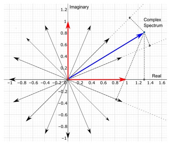 - Define a list of unitary vectors on the complex plane, which will constitute the basis for a vector space , defined by a set of vectors . Each vector is calculated as:where k is the index of the vector, K is the total number of vectors (in this application, , which includes 14 unitary vectors, along with the real part and the imaginary part), and represents the frequency data points. These vectors are equally distributed around the unit circle in the complex plane. Refer to Figure 2 for visualization.