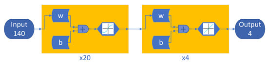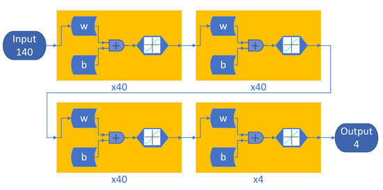 DNNs are an extension of MLP networks. In this case, the network comprises more than one hidden layer, but follows exactly the same approach as MLP networks in Section 3.3.1 above. An example of the DNN design can be found in Figure 4. As in the case of the MLPs, our application also considers 140 input samples and 4 outputs, with a different number of hidden layers. Again, the activation function selected for the hidden layers is the sigmoid function.