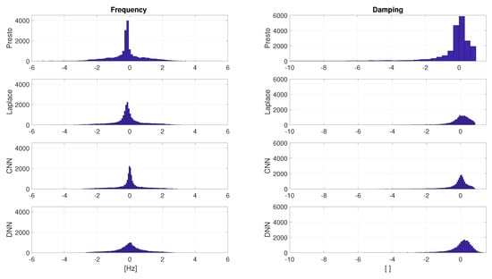 Figure 6 presents a comparison between the error histograms of PRESTO, Laplace Wavelet Matching Pursuit, a CNN with 100 × 6 neurons, and a DNN with 100 × 100 × 100 neurons as samples for comparison. It should be noted that the other neural network processing techniques exhibit a similar behavior. The plot reveals a very similar distribution for the CNN and Laplace methods. The CNN demonstrates notably better performance in damping and frequency, while the DNN performs slightly worse in frequency.
