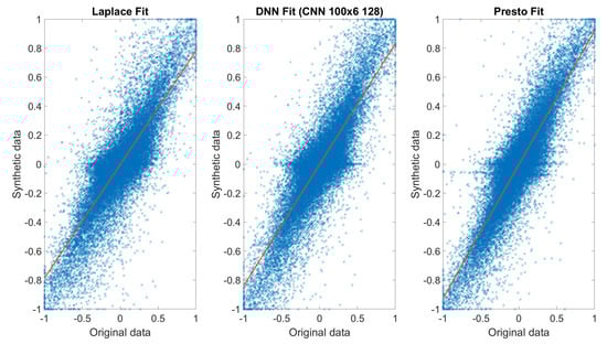 Scatter plot comparing the regression curves of real data and synthetic reconstructed data. A comparison between Laplace Wavelet Matching Pursuit, PRESTO, and a CNN 100 × 6, taken as a sample method, is shown. The horizontal axis shows the normalized original time series data, while the vertical axis represents the respective reconstructed normalized signals. The red line represents the linear regression curve.
