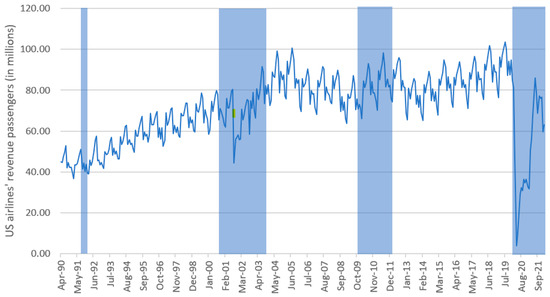For this research, predictor variables were selected based on previous research, such as gross domestic product, crude oil and jet fuel prices, unemployment rates, and the industrial production index. In addition to previously researched predictor variables, data that are indirectly significant for air transport demand, which were not considered in earlier research, were also collected. Some of them are homeownership rate, probability of recession, uncertainty index, and effective exchange rates. The data set used for the study covers the period from April 1990 to February 2022, monthly. The selected period includes five significant crises in the air transport industry of the United States of America (illustrated in Figure 2): The Gulf War (1990–1991), which caused the price of fuel to rise and thereby forced as many as seven major airlines (including PanAm) into bankruptcy, from which they did not recover; the terrorist attack on the United States of America (11 September 2001); the SARS epidemic (2003); the global financial crisis (2008); and the latest crisis caused by the COVID-19 pandemic (started in the first quarter of 2020).